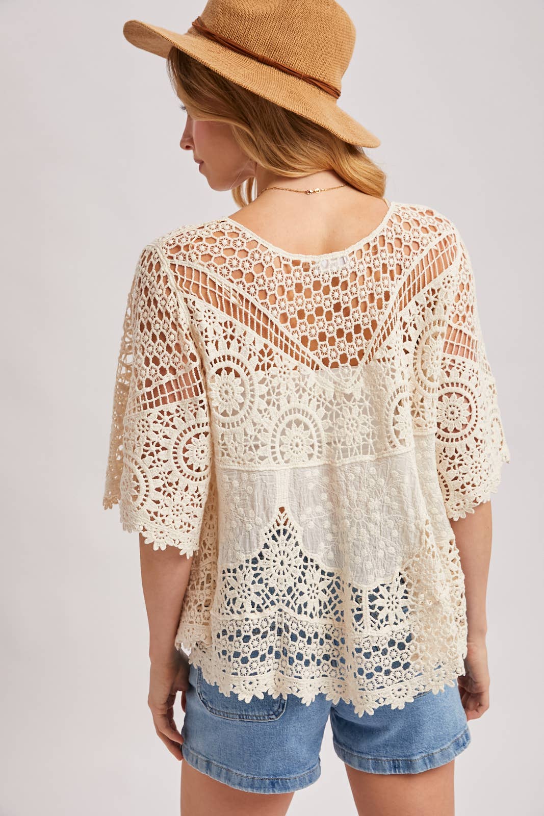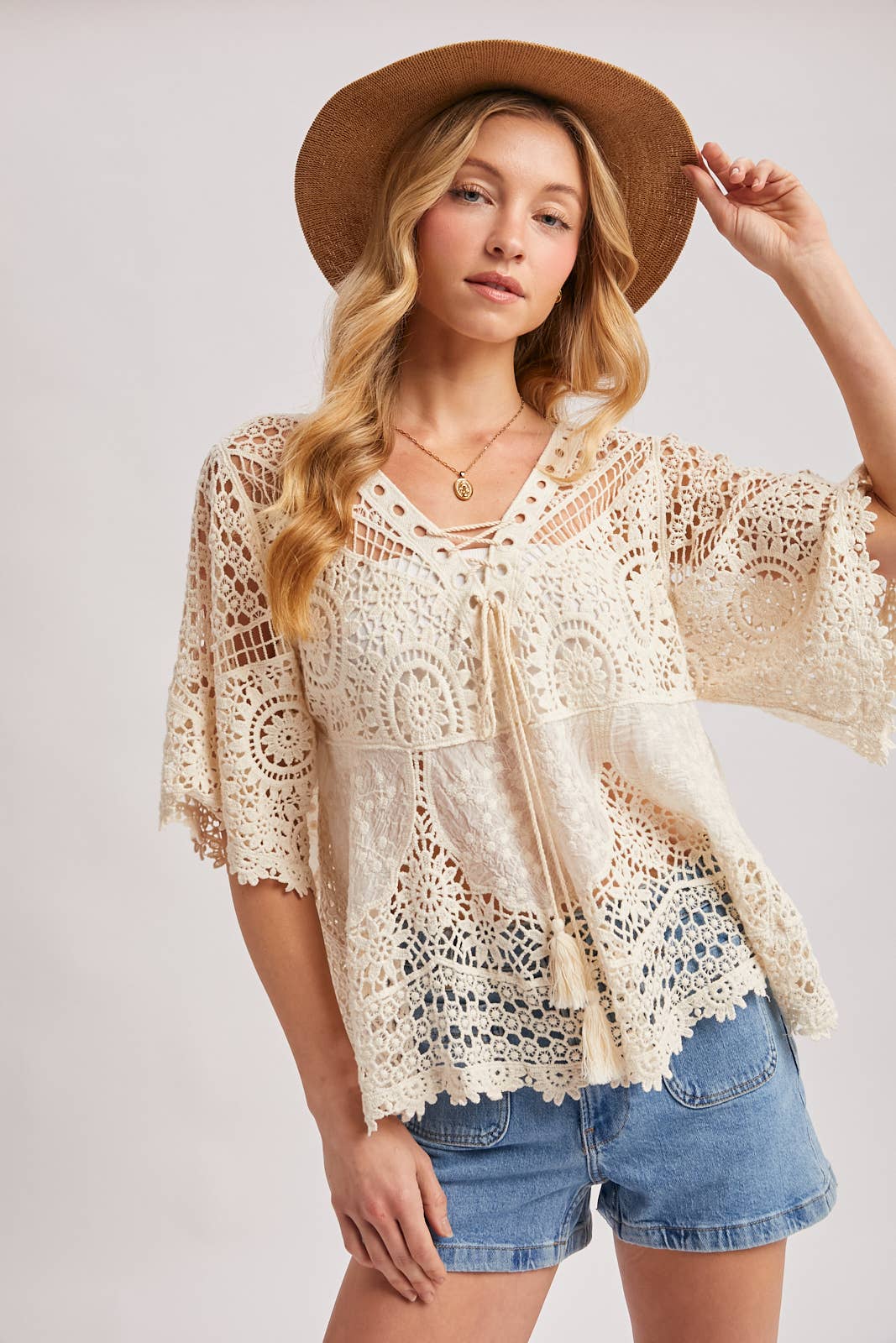 Boho Sheer Crochet Lace Top with Tassels - Natural