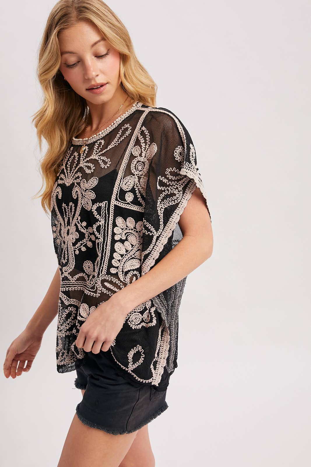 Embroidered Mesh Crochet Top - Black with Ivory Detail