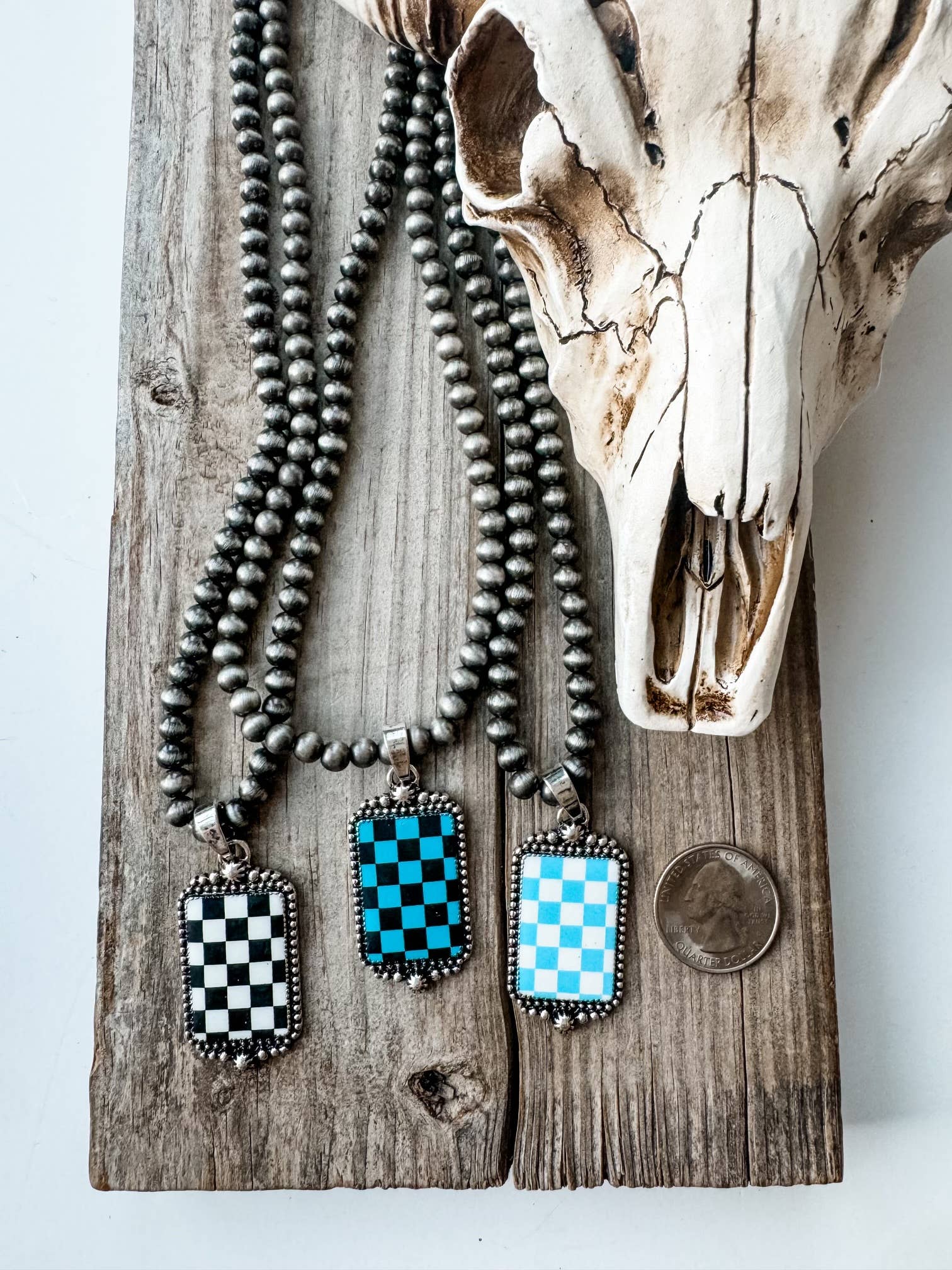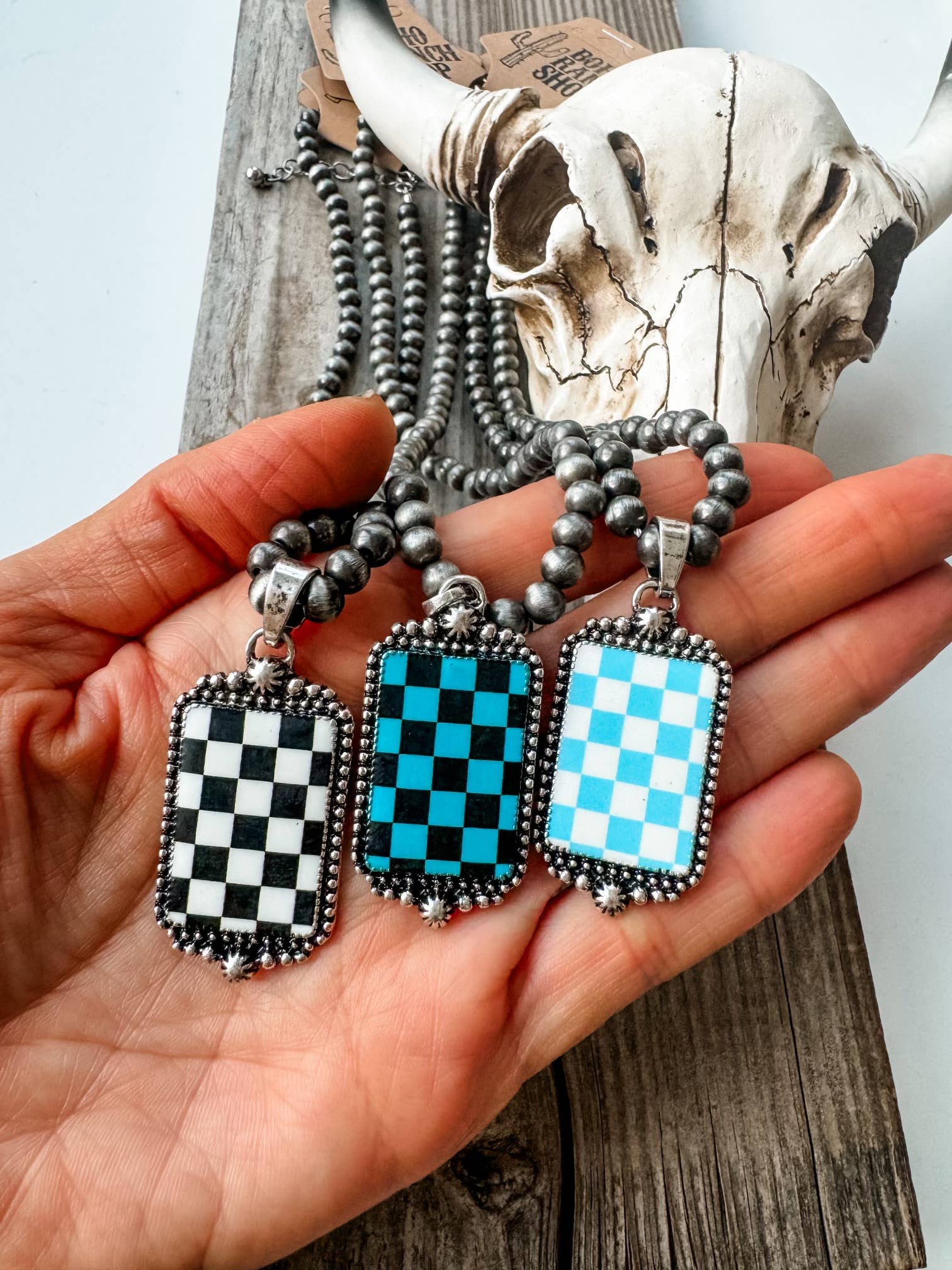 Embrace the spirit of the West with this striking checkered pendant necklace, where rustic charm meets modern elegance. The burnished silver finish catches the light beautifully, while the distinctive black turquoise checkered pattern adds bold character to any outfit.