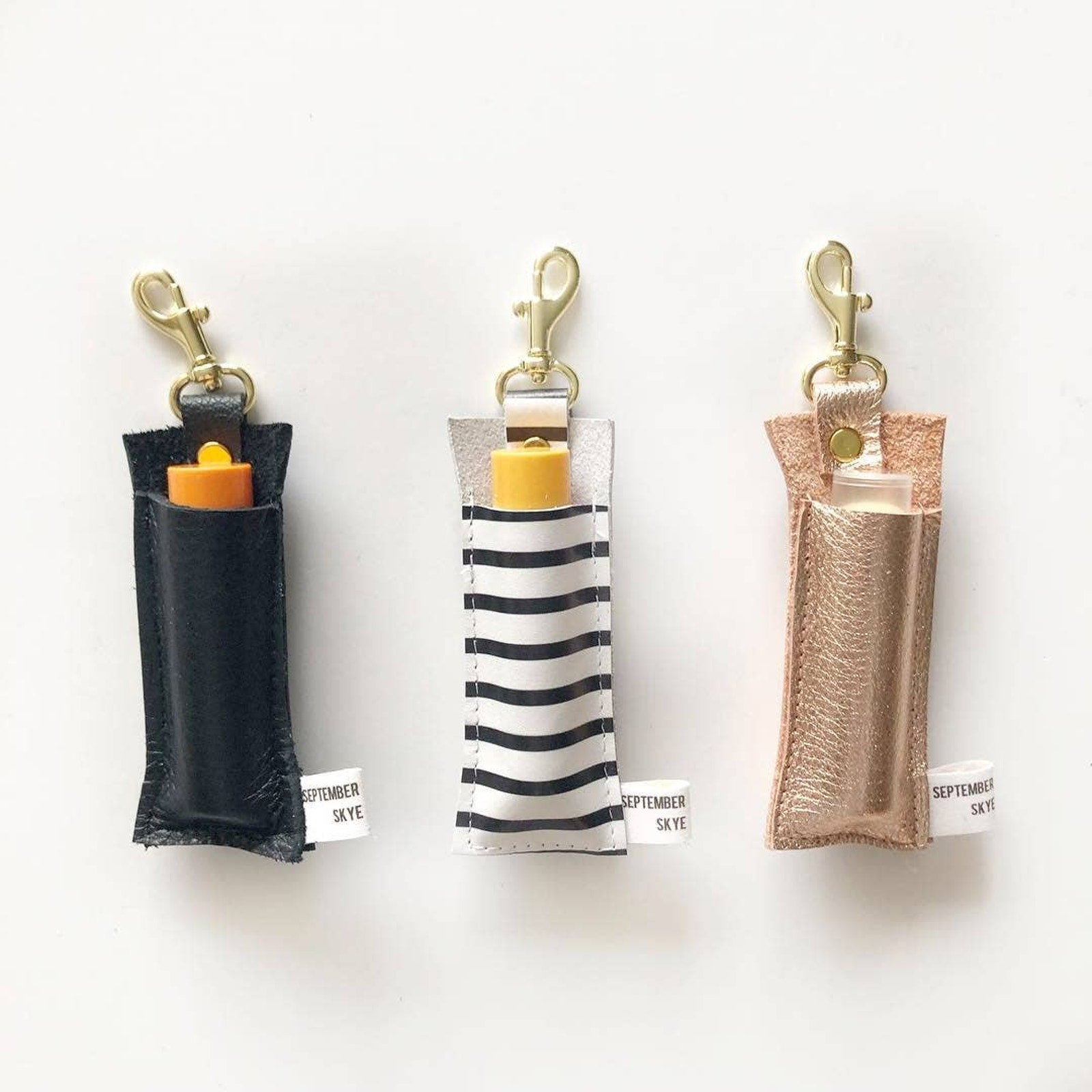 Never dig through your bag for your chapstick again. This Genuine Leather Lip Balm & Lipstick Holder Keychain in metallic rose gold keeps your favorite lip essential right where you need it — clipped to your purse, keys, or backpack and ready to go.