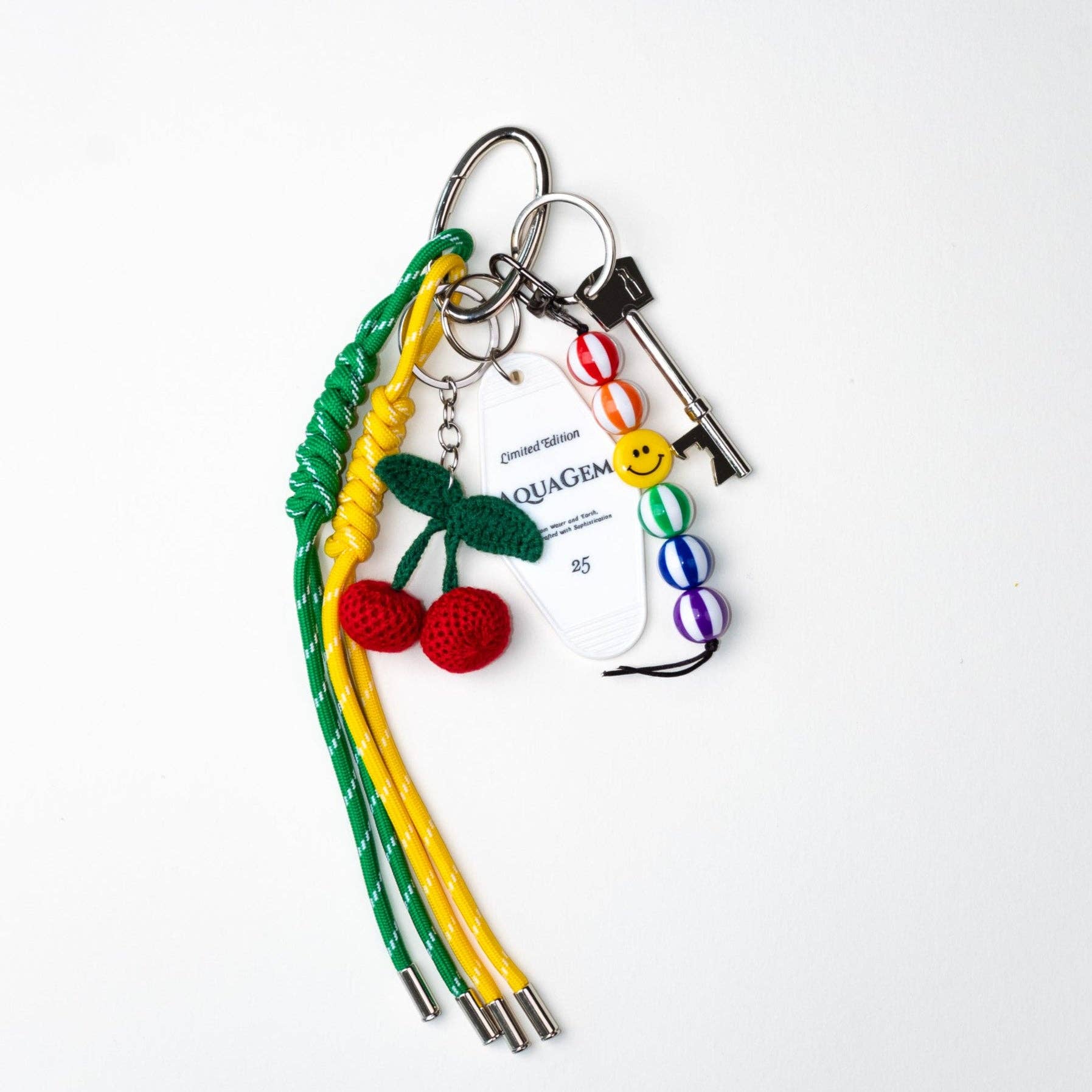 Cherry Smiley Charm ā Fruity Rainbow Bag Charm with Beads & Cherry Feel good. Look bold: š Crocheted cherries š Rainbow beads & Smiley š Vintage key
