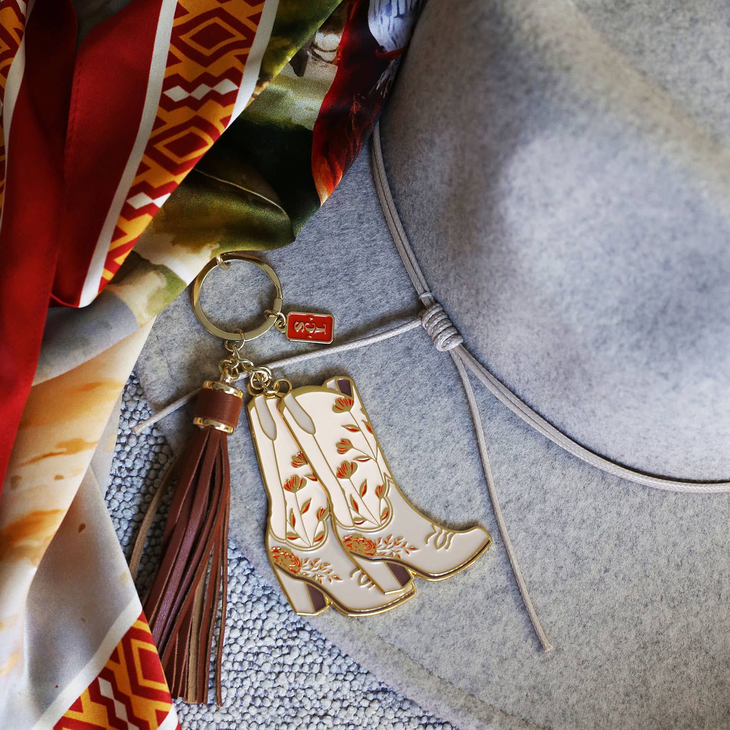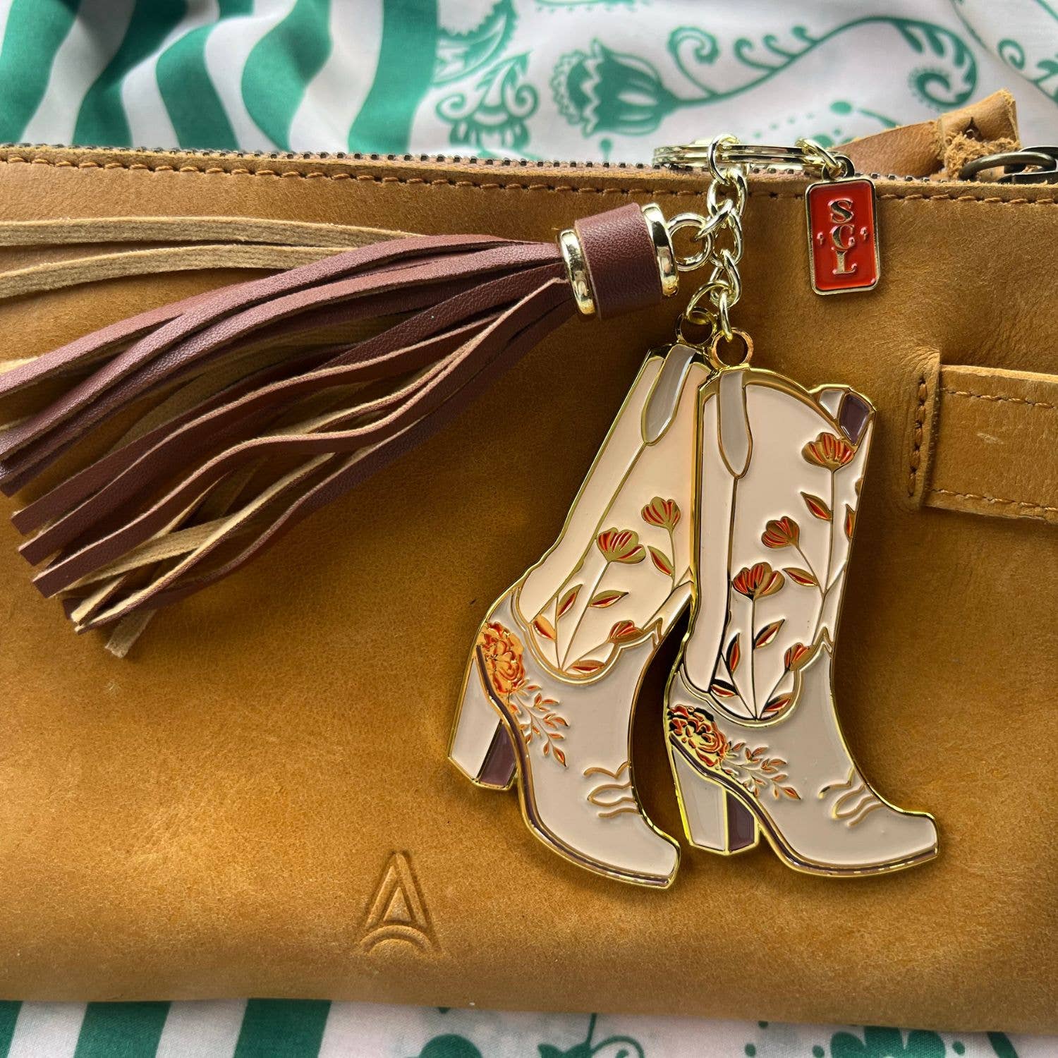 Chic with boho western flair, our Texas-sized statement keychain in Pink Floral features a pink and rust hued floral design for the fashion forward feminine cowgirl. Our signature keychain includes two cowgirl boots, one SCL logo charm, a lobster claw clasp and tassel. The cowgirl boot charms are 3” tall and 1.75” wide. Our fashion keychain’s color palette features delicate pink and rust hues with gold and brown accents and a chocolate brown tassel. Custom designed and assembled in the USA 2D soft enamel charms with gold tone plating Boot charms are 3” tall, keychain ring and clasp add 3.5 inches when hung Arrives secured on a lovely signature custom card.