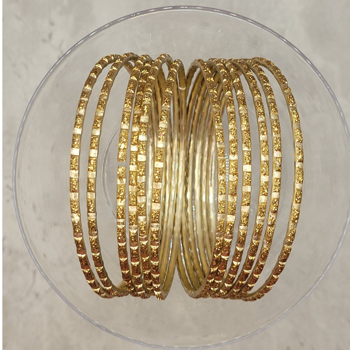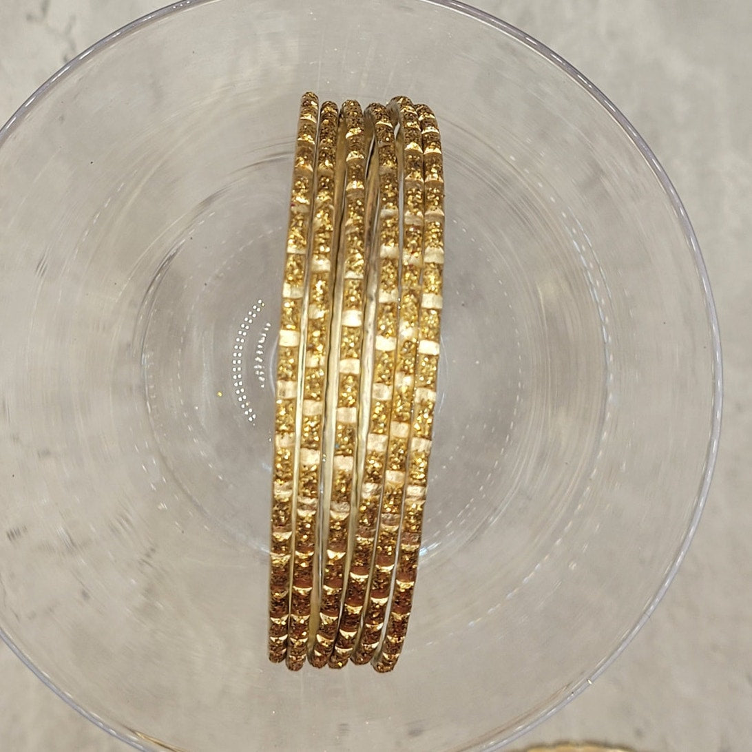 Gold with Gold Glitter Dashes Thin Metal Bangles Metallics Stack of 6