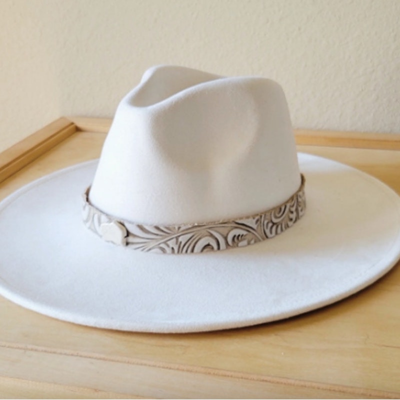 Sandy White Floral Embossed Leather Hat Band with White Turquoise Slab