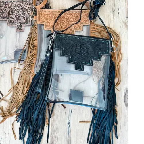 Finally, a stadium-approved clear bag that doesn't sacrifice style! The Shayne bag combines practical clear vinyl construction with gorgeous hand-tooled black leather trim and flowing fringe. Perfect for concerts, sporting events, and any venue with clear bag policies, this spacious crossbody holds all your essentials while making a bold Western statement.