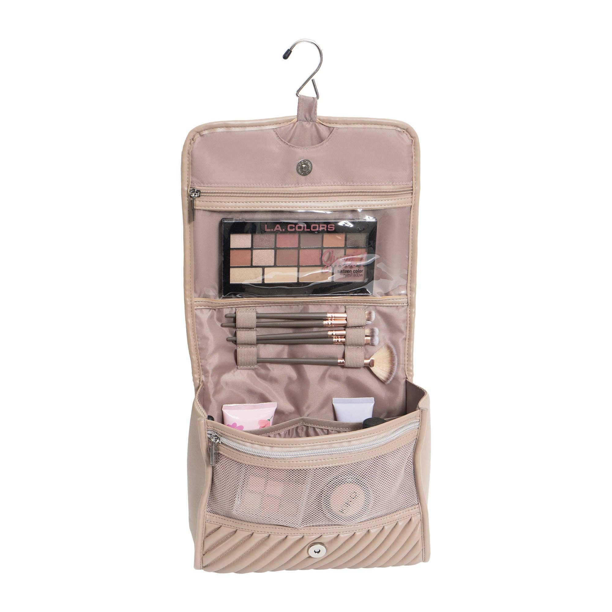 Elegant diagonal quilting meets generous travel organization in this spacious hanging toiletry case. The refined silhouette opens to reveal clear compartments and slip pockets that keep your full-size beauty essentials visible and organized, while the built-in hook lets you hang it anywhere—freeing up precious counter space in hotel bathrooms or guest rooms.