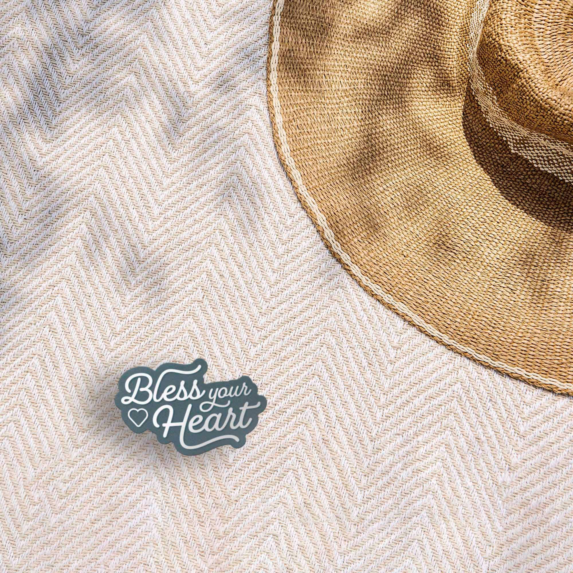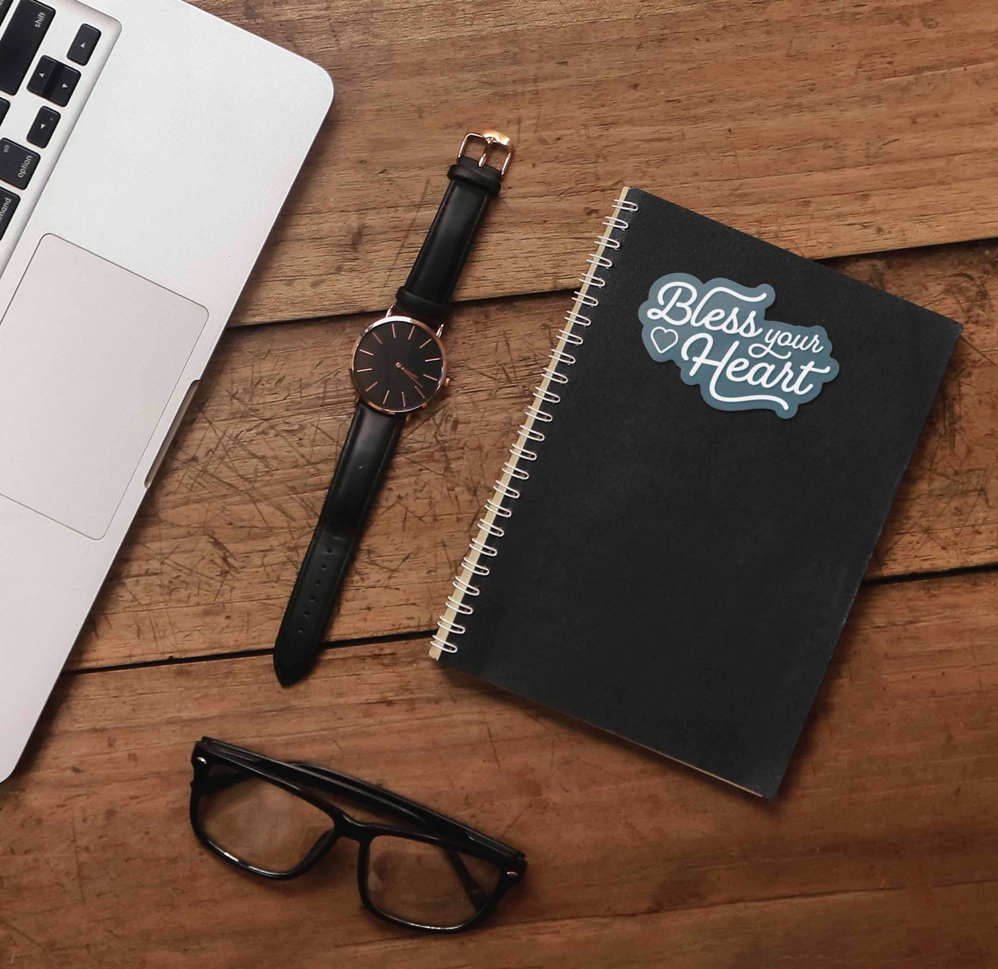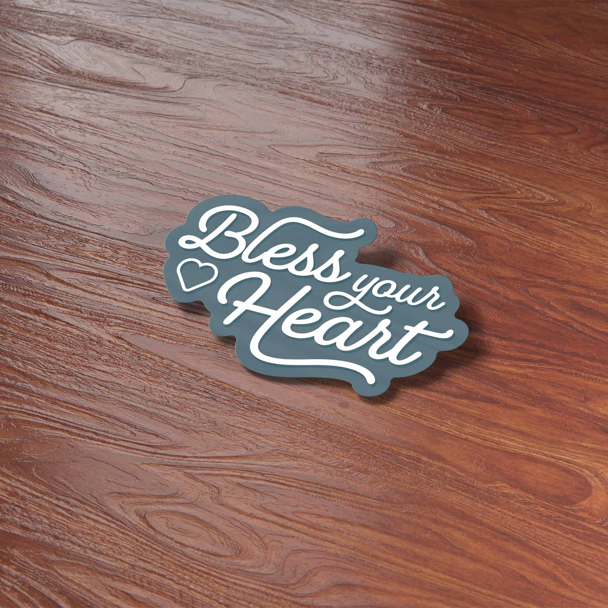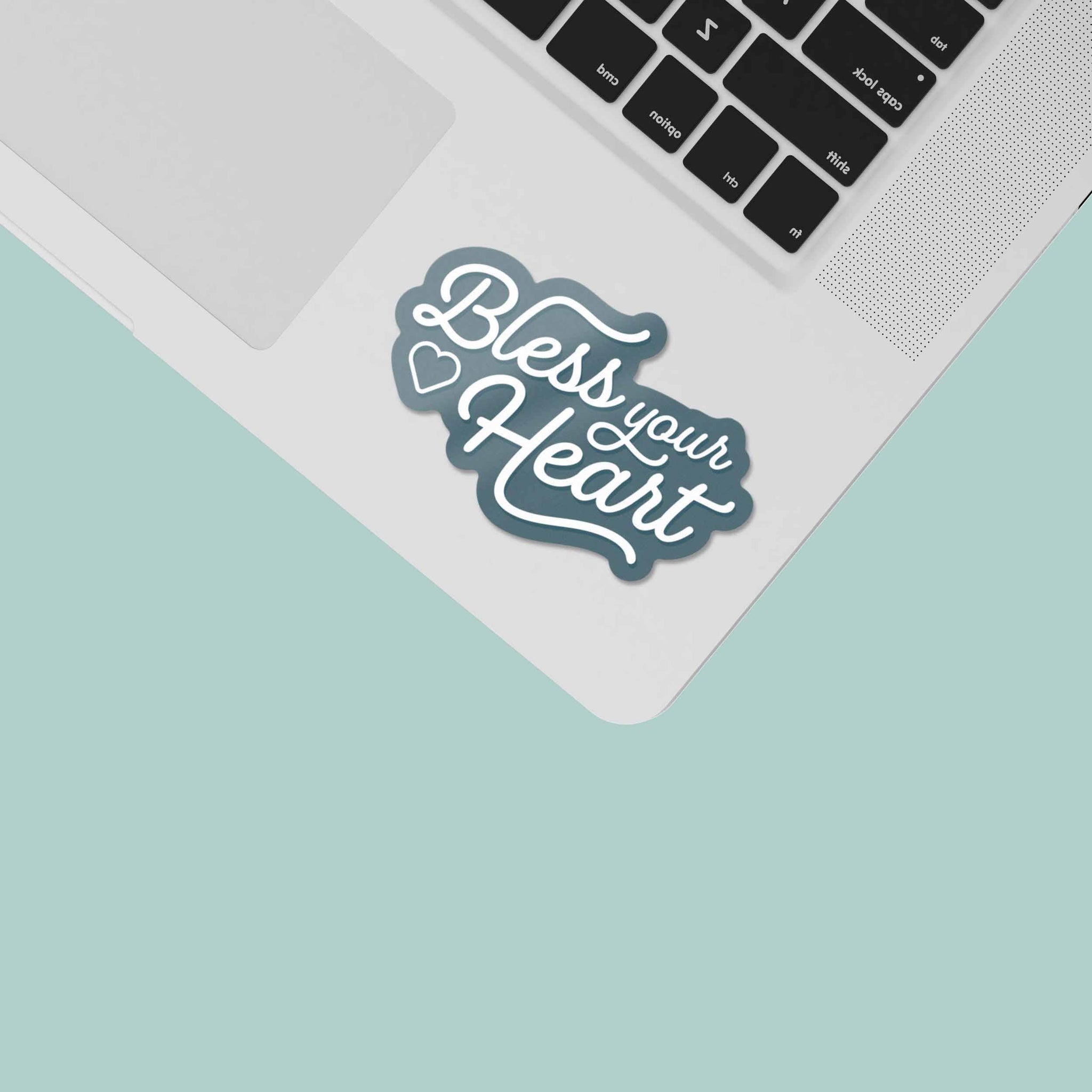Bless Your Heart southern saying sticker. 2.75" wide laptop decal size. Durable die-cut vinyl decal with a matte UV-resistant coating. Waterproof & weatherproof for indoor & outdoor use. Made in USA. Perfect souvenir or impulse buy item for gift shops, boutiques, bookstores, farm supplies, & western stores. Well bless your heart! This expression is said with a little twang, a little condescension, and a lot of southern charm. Celebrate the southern accent with a cute typography sticker. Great gift for friends in Texas, Louisiana, Georgia, Arkansas, or any state in the south. Perfect waterproof decal for Hydroflask water bottles, Yeti coolers, wine glasses, coffee mugs, & thermoses. Display this cute Bless Your Heart sticker on your phone, iPad, Kindle, or journal. Designed & printed in North Texas.