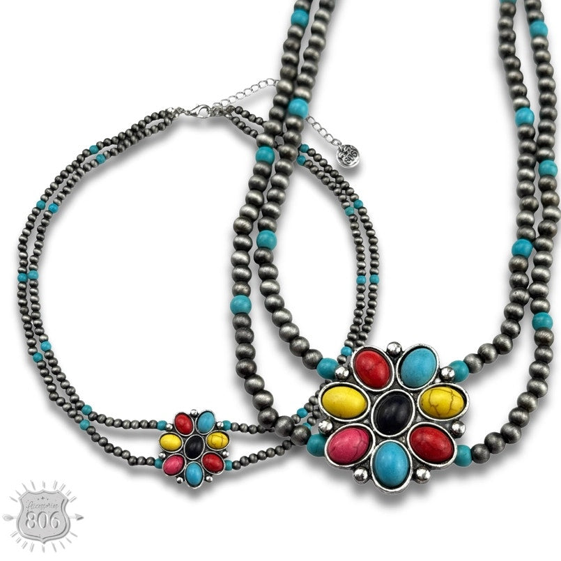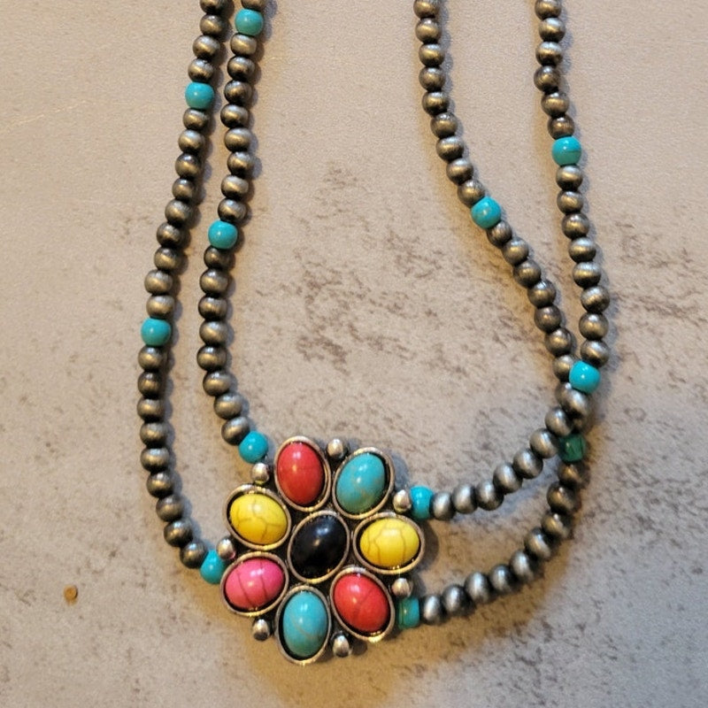 This western style necklace has two silver and turquoise color stone bead strands connected by a stone flower shape pendant.
