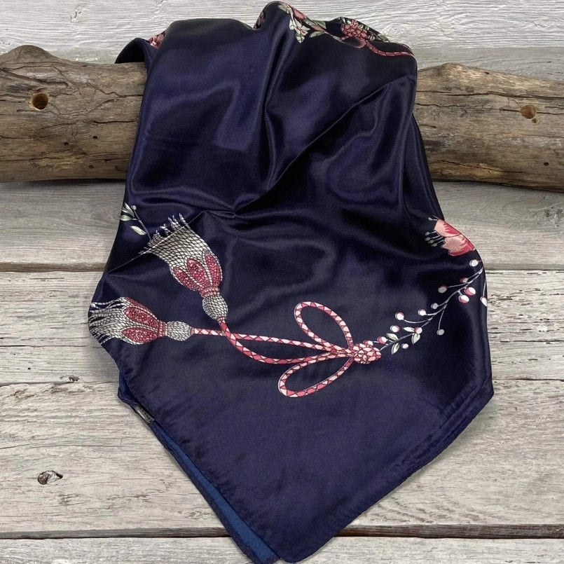 Our classic wild rag/scarf in royal blue with pink rose buds and tassels pattern. It is a square and measures 35" x 35". It is sure to add a bright pop of color to any outfit.