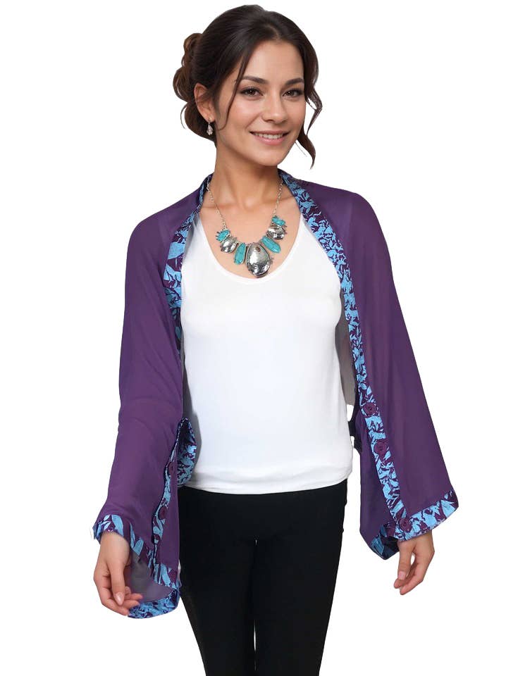Origami Trim Button Shawl Shrug Wrap Purple with Eggplant Turquoise Trim