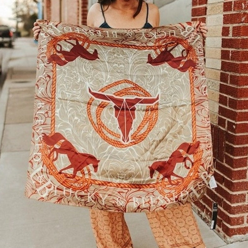 This statement western wild rag showcases a bold longhorn centerpiece framed by classic rope detailing and running horse silhouettes for an unmistakably western feel. Warm bone, tan, and rust tones blend seamlessly with intricate scroll-style background artwork, giving this wild rag a rich, heritage-inspired look rooted in ranch and rodeo tradition. The detailed border adds depth and polish, making it a standout accessory that feels both timeless and on-trend.
